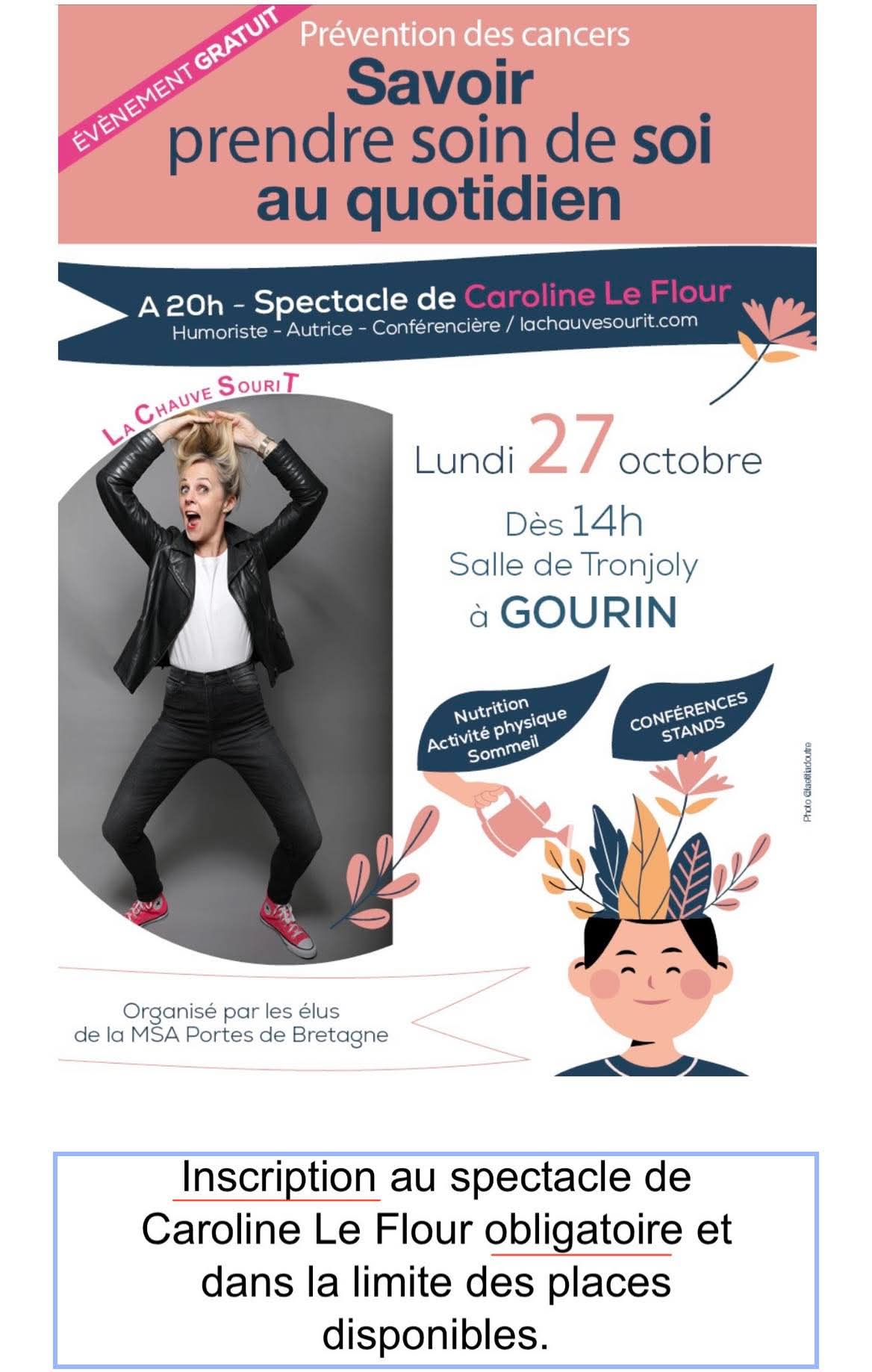 La MSA organise une journée dédiée à la prévention des cancers. De 14h à 19h stands d’information et conférences (santé, dépistages, nutrition, sommeil, prévention) et à 20h spectacle de Caroline Le Flour, humoriste, autrice et conférencière (« La Chauve SouriT ») sur inscription.