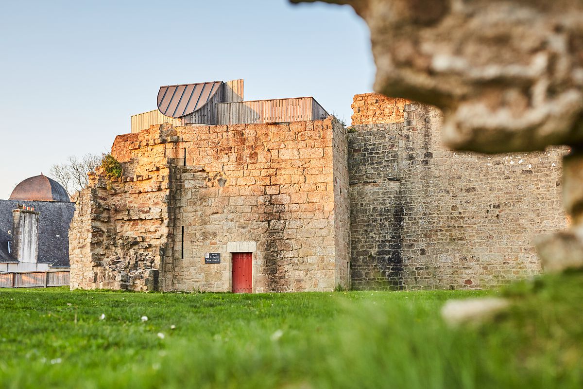 Ces vestiges témoignent des différentes phases de construction héritées des seigneurs qui se sontsuccédé au XIVe siècle. La construction de la muraille aurait débuté sous Roger Davis, lieutenantd’Edouard III, capitaine du château pendant la guerre de Succession de Bretagne et se seraitachevée lors des grands travaux d’aménagement commandités par Jean Ier de Rohan et Jeannede Navarre. Cet ensemble, qui protégeait la cité, était aussi appelé Châtel Anglais.