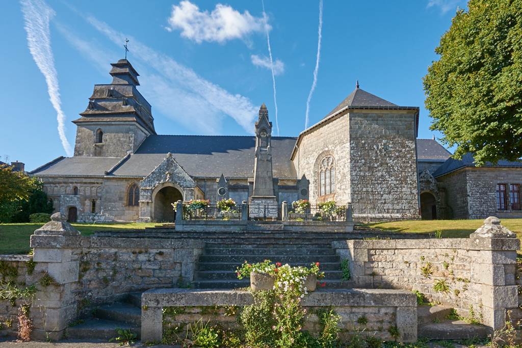 L’église Notre-Dame-de-l’Assomption fut édifiée par la famille Boutteville, seigneurs du Faouët, mécènes de l’architecture locale. Ses trois vaisseaux à huit travées ainsi que la tour-porche et l’ossuaire qui lui est adossé datent de la fin du XVe siècle. L’église actuelle a été remaniée à de nombreuses reprises comme par exemple le transept sud en 1852, le voûtement ou l’architecture du choeur et des sacristies en 1917 suite à un incendie qui détruisit la toiture. De nos jours, l’église comprend une nef avec bas-côtés, un transept et un choeur polygonal. La nef communique avec les bas-côtés par de grandes arcades à cintre brisé. L’ossuaire possède des portes en anses de panier et deux baies trilobées. La tour-porche, dont on a modifié le fronton au XVIIIe siècle, constitue la partie la plus originale de l’édifice avec les multiples brisis de la charpente à quatre pans supportant la toiture d’ardoise. Elle rappelle une pagode A l’intérieur, on peut voir deux gisants appartenant à un tombeau du XVe siècle, toujours à côté de l’église. Il est sculpté aux armes des Boutteville et des Trogoff. Les gisants furent déposés dans l’édifice en 1917. Les deux personnages représentés sont Bertrand de Trogoff, vêtu d’une armure et Pérronnelle de Boutteville portant une coiffure à cornes.