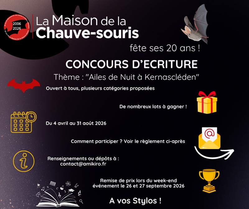 Pour les 20 ans de la Maison de la chauve-souris, participez à un concours d’écriture ! Que vous soyez adultes ou enfants, tout le monde peut participer ! Que ce soit sous la forme d’une poésie, d’une histoire courte, d’une nouvelle ou encore d’une planche BD ou d’un trois cases… seule la créativité et l’originalité compte ! Le règlement est sur le site internet ou sur demande. Date limite : 31 août.