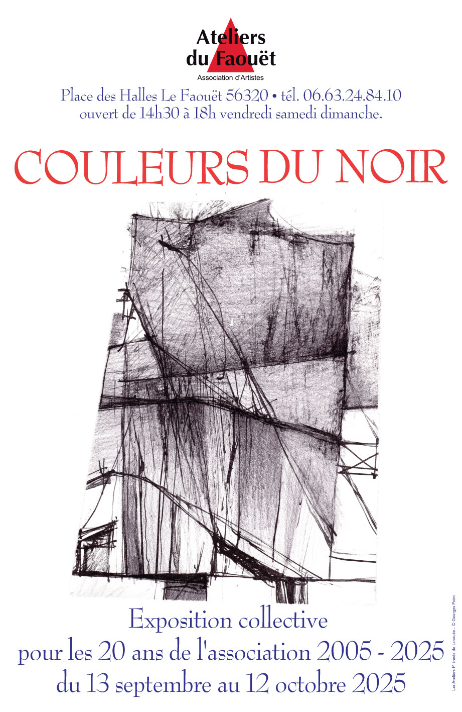 Expo collective pour les 20 ans de l’association. Avec : Adrianna Bonomi, Armano, Denis Chedaleux, Dominique De Boffle, Nina Finch, Nathalie Garatti, Nicole C.Guillemet, Gweltaz, Corinne Jacob, Bernard Jund, Patrick Lequeux, Thierry Le Saëc, Michel Le Sage, Majo Marchand, Philippe Miénnée, Antonio Monasterio, Laurent Montassine, Lutina Pinsard, Yves Picquet, Georges Point, Jean-François Robic, Francis Rollet, Christine Sibre, Marie Thamin, Michel Thamin, Oscar Yana. Ouvert vendredi, samedi et dimanche.