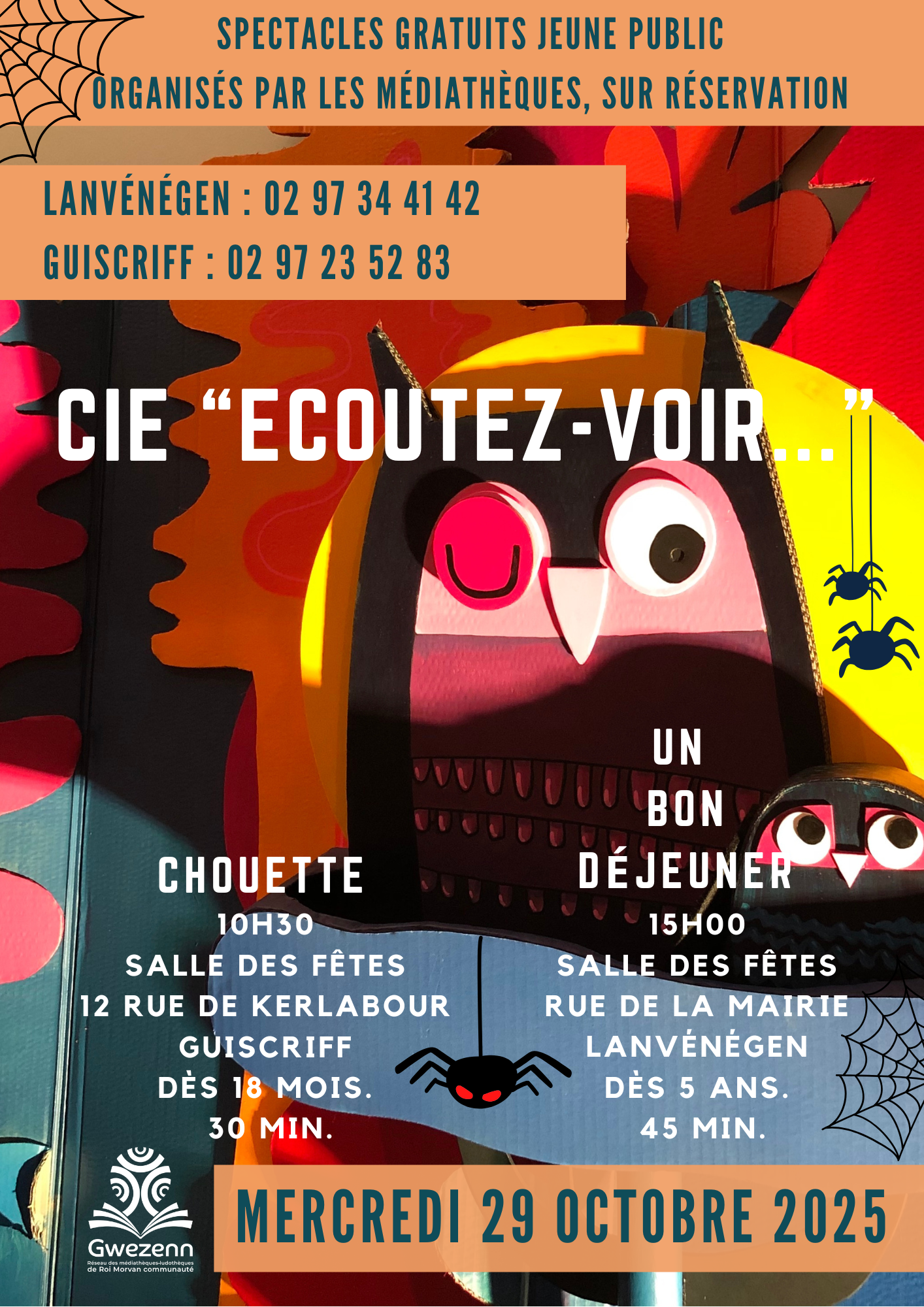 Le matin à Guiscriff « CHOUETTE » pour les plus petits, dès 18 mois, à 10h30 et le spectacle « UN BON DEJEUNER », dès 5 ans (histoire d’ogresse), à 15h. GRATUITS.