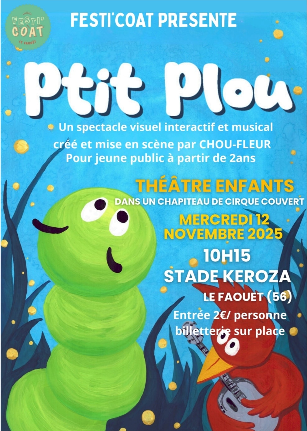 Un spectacle poétique et drôle pour les enfants à partir de 2 ans, sous chapiteau. L’occasion parfaite pour partager un joli moment en famille. Billetterie sur place. Organisé par le Festi’Coat.