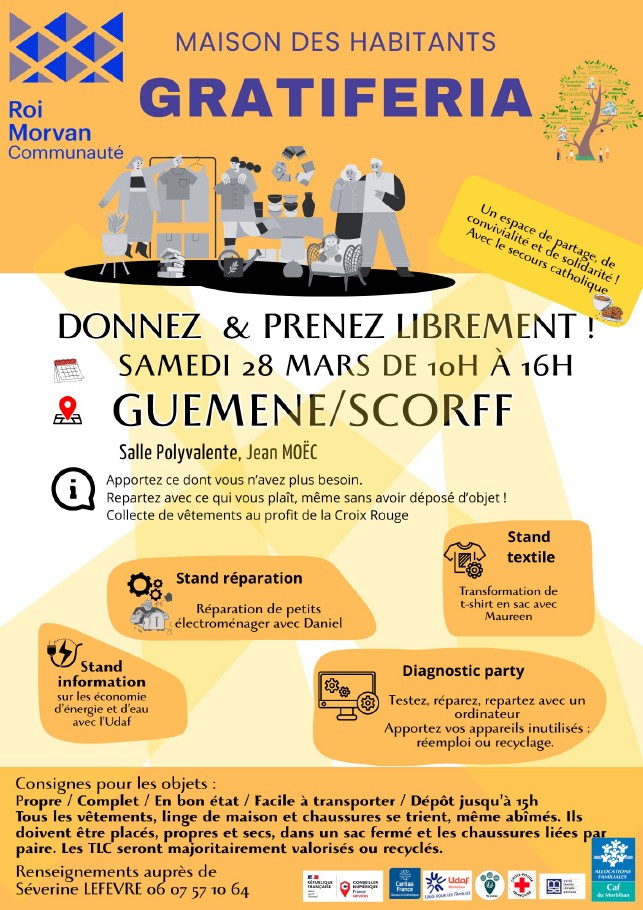 Donnez et prenez librement lors de la gratifieria ! Apportez ce dont vous n’avez plus besoin. Repartez avec ce qui vous plaît, même sans avoir déposé d’objet ! Collecte de vêtements au profit de la croix rouge. Les objets apportés doivent être : propres, en bon état, faciles à transporter. Les dépôts sont possibles jusqu’à 15h. Tous les vêtements, linge de maison et chaussures se trient, même abîmés. Ils doivent être placés, propres et secs, dans un sac fermé et les chaussures liées par paire ; Profitez aussi de divers ateliers au cours de cette journée : au stand textile, transformez un t-shirt en sac ; au stand réparation, réparez de petits électroménagers avec l’animateur ; au stand d’information, bénéficiez de conseils sur les économies d’énergie et d’eau avec l’Udaf ; au stand « diagnostic party », apprenez à tester et réparer un ordinateur, apportez vos appareils inutilisés pour qu’ils soient réemployés ou envoyés au recyclage.