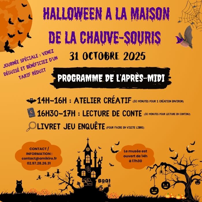 Venez déguisé et profitez de la visite du musée à tarif réduit. De 14h à 16h, un atelier créatif de 30 mn est proposé. Repartez avec une chauve-souris de votre création (3€). Pour les plus jeunes une lecture de conte est proposée de 16h30 à 17h. Enfin, pour les enfants à partir de 7 ans, un livret jeu enquête est disponible pour la visite libre.
