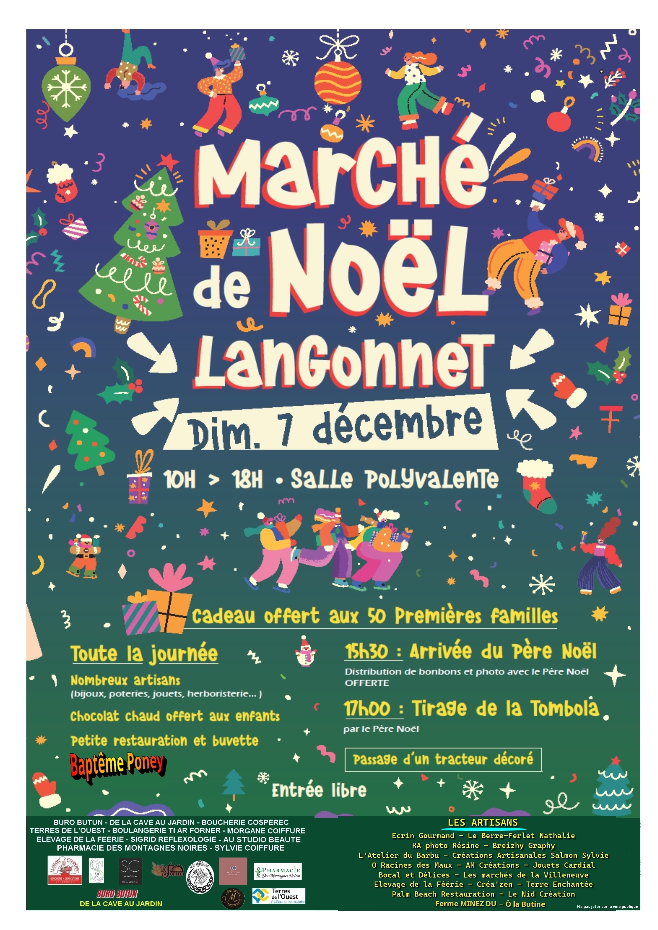 Trouvez des idées de cadeaux avant les festivités de fin d’année… Un marché de produits artisanaux locaux et bretons ! Baptême poney. Visite du Père Noël. Buvette et restauration. Chocolat chaud offert aux enfants. Cadeau aux 50 premiers visiteurs. Selon météo : Baptême poney, Châtaignes grillées. Arrivée du père noël à 15h, distribution de bonbons, photos. Tirage de la tombola à 17h par le père Noël. Passage d’un tracteur décoré illuminé aux couleurs de Noël. Organisé par l’association « Tous Langonnetais ». Au vu de la présence des enfants et des poneys et du tracteur l’après-midi, le parking de la salle polyvalente ne sera accessible qu’aux PMR.