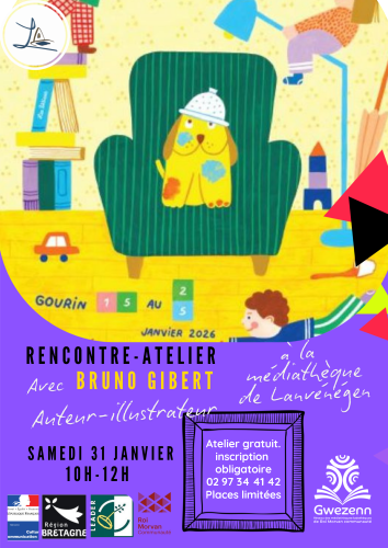 Rencontre & atelier avec l’auteur-illustrateur Bruno Gibert. La Médiathèque de Lanvénégen, en partenariat avec le réseau Gwezenn, a le plaisir de vous inviter à un moment privilégié de création et de partage dans le cadre du Salon du Livre Jeunesse du Pays du Roi Morvan 2026.Pour qui ? Enfants (dès 6 ans), ados et adultes Sur inscription. Venez découvrir les coulisses de son métier et participer à un atelier pratique. Que vous soyez un artiste en herbe ou simplement curieux.
