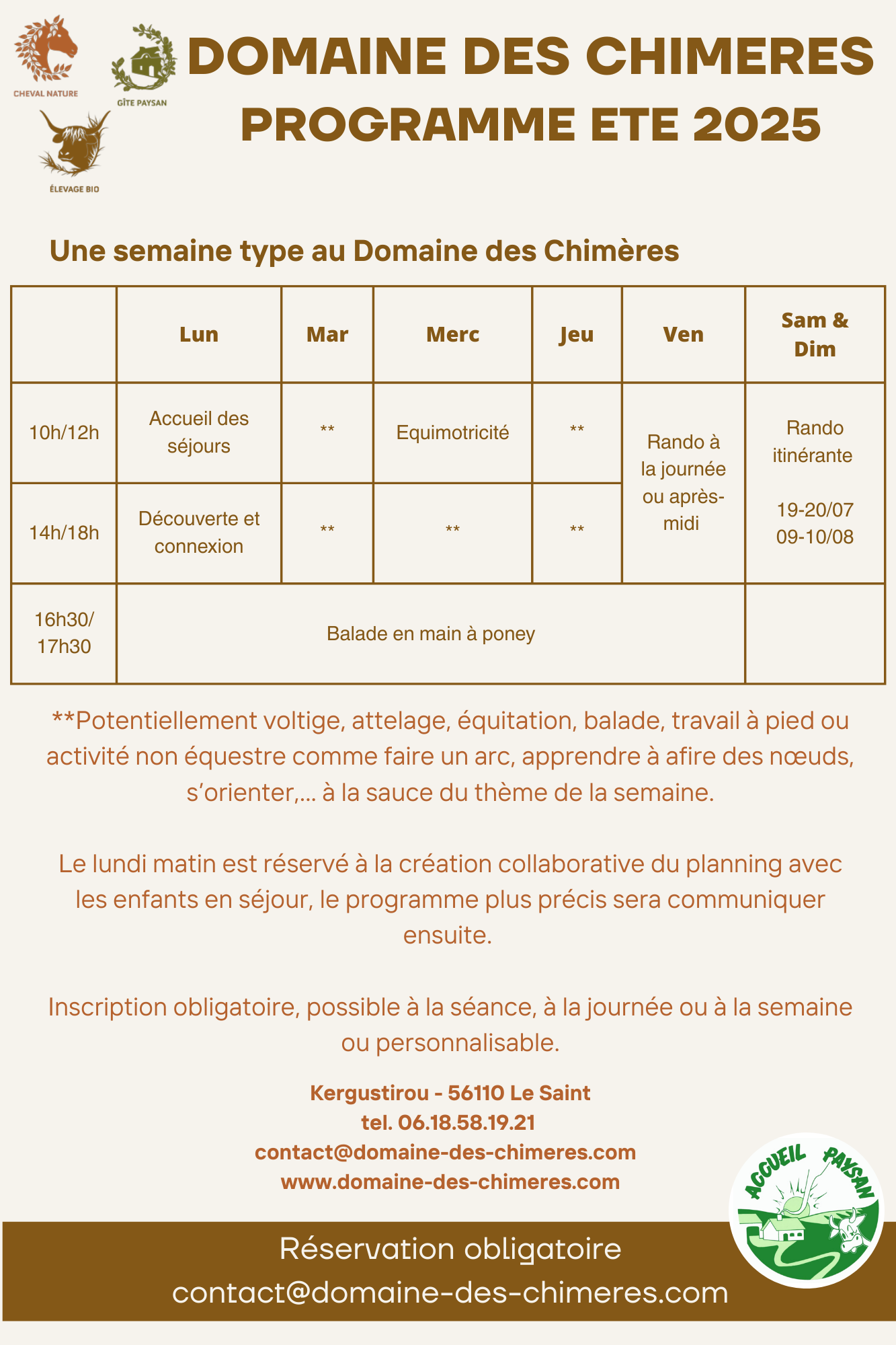 Nous accueillons vos enfants (6/14 ans) durant les vacances de la Toussaint. Au programme de la semaine : bricolages d’automne, châtaignes grillées au coin du feu, soins aux animaux de la ferme (chevaux et vaches), balade en forêt, fabrication de jus de pommes (non confirmé). A la journée ou en pension complète à la semaine.