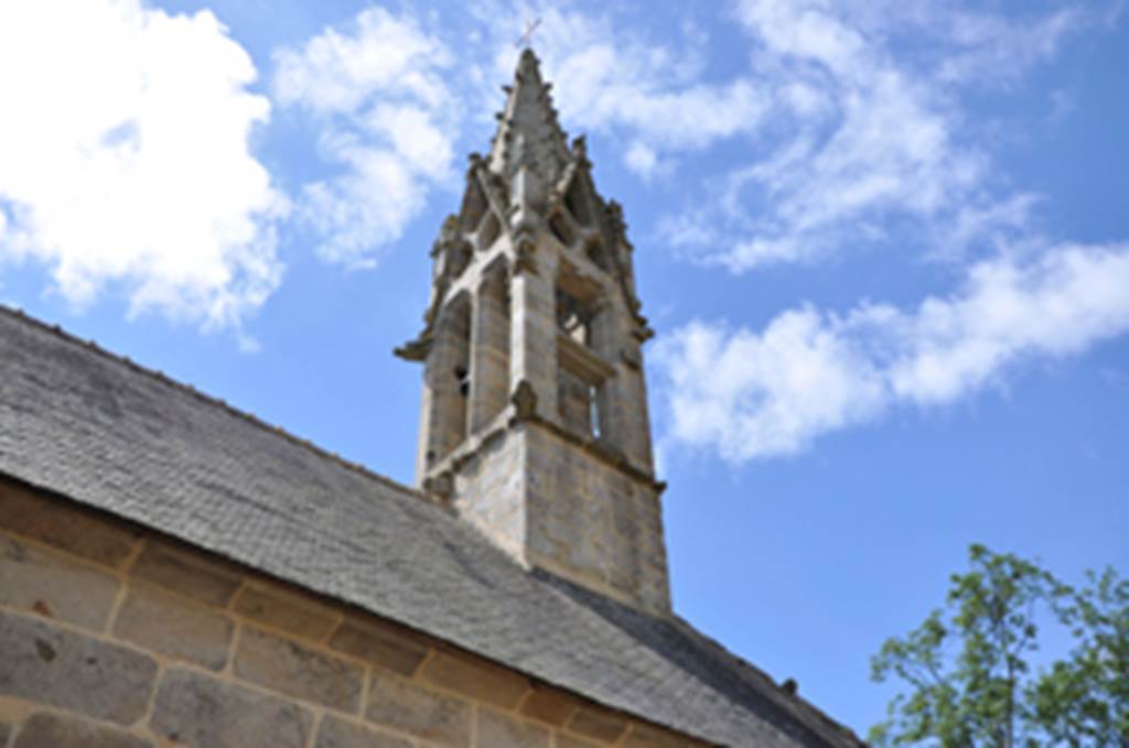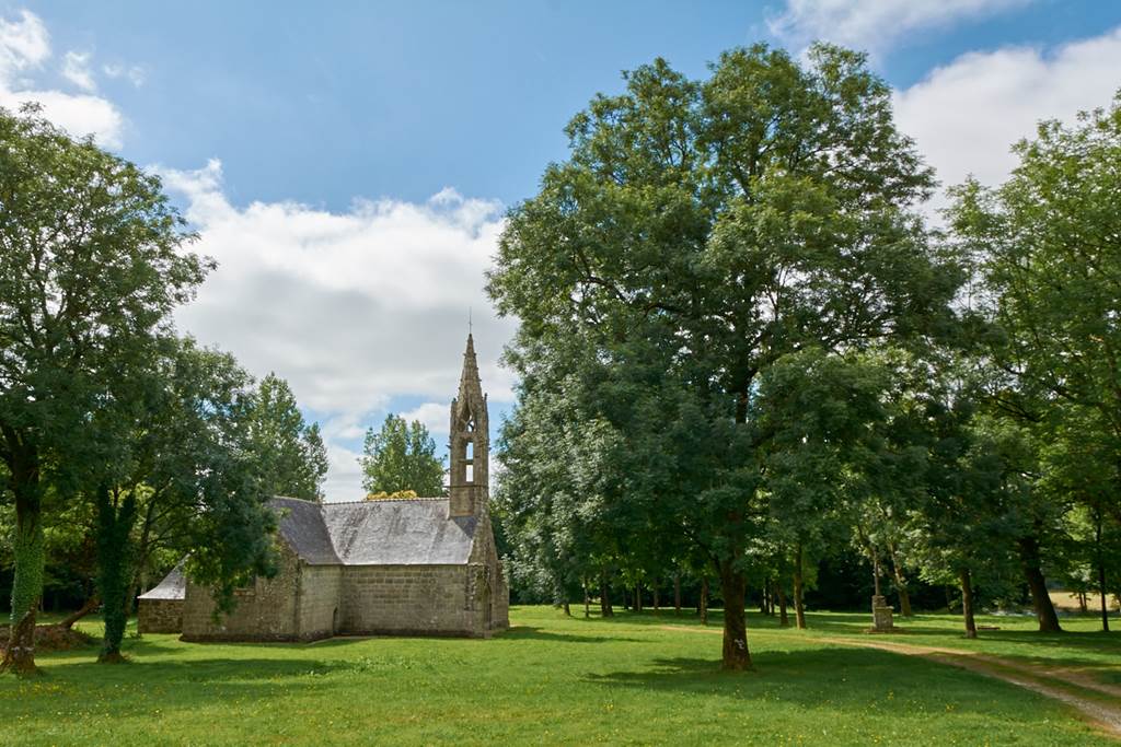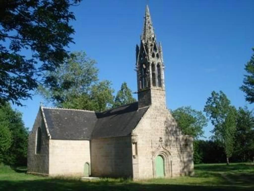 La chapelle, en pierres de taille, fut construite de 1518 à 1536. C’est Henri et Vincent de Kergoët, seigneurs de Tronjoly et de Menguionned qui la commencèrent. Elle fut achevée par Yves de Boutteville, fils du baron du Faouët Jean IV de Boutteville et abbé de Langonnet de 1518 à 1538. Ce bel exemple de Renaissance bretonne dresse fièrement sa tour-clocher entièrement ajourée. A gauche du portail, on peut voir un personnage grotesque sculpté sur un contrefort. Du côté opposé, une belle niche ornée a perdu sa statue. A l’intérieur, on se laisse charmer par la voûte lambrissée et les sablières décorées de motifs végétaux encerclant animaux et petits personnages. La chapelle abrite aussi deux statues de Saint Hervé. Selon la légende, Saint Hervé, talentueux musicien aveugle, apprivoisa le loup qui avait dévoré son âne. Il en fit une bête de trait pour tirer sa charrue. C’est pourquoi Saint Hervé est toujours représenté accompagné d’un loup. Lors de leur dévotion à Saint Hervé, les pèlerins avaient pour habitude de lui offrir des crins de chevaux afin qu’il protège les troupeaux. Il est invoqué, plus généralement, contre les attaques des loups. N’oublions pas que Saint Hervé est le patron des bardes et des sonneurs. Ce n’est pas un hasard si, tous les ans en septembre, les meilleurs sonneurs de Bretagne s’affrontent à Gourin lors du championnat de musique traditionnelle.
