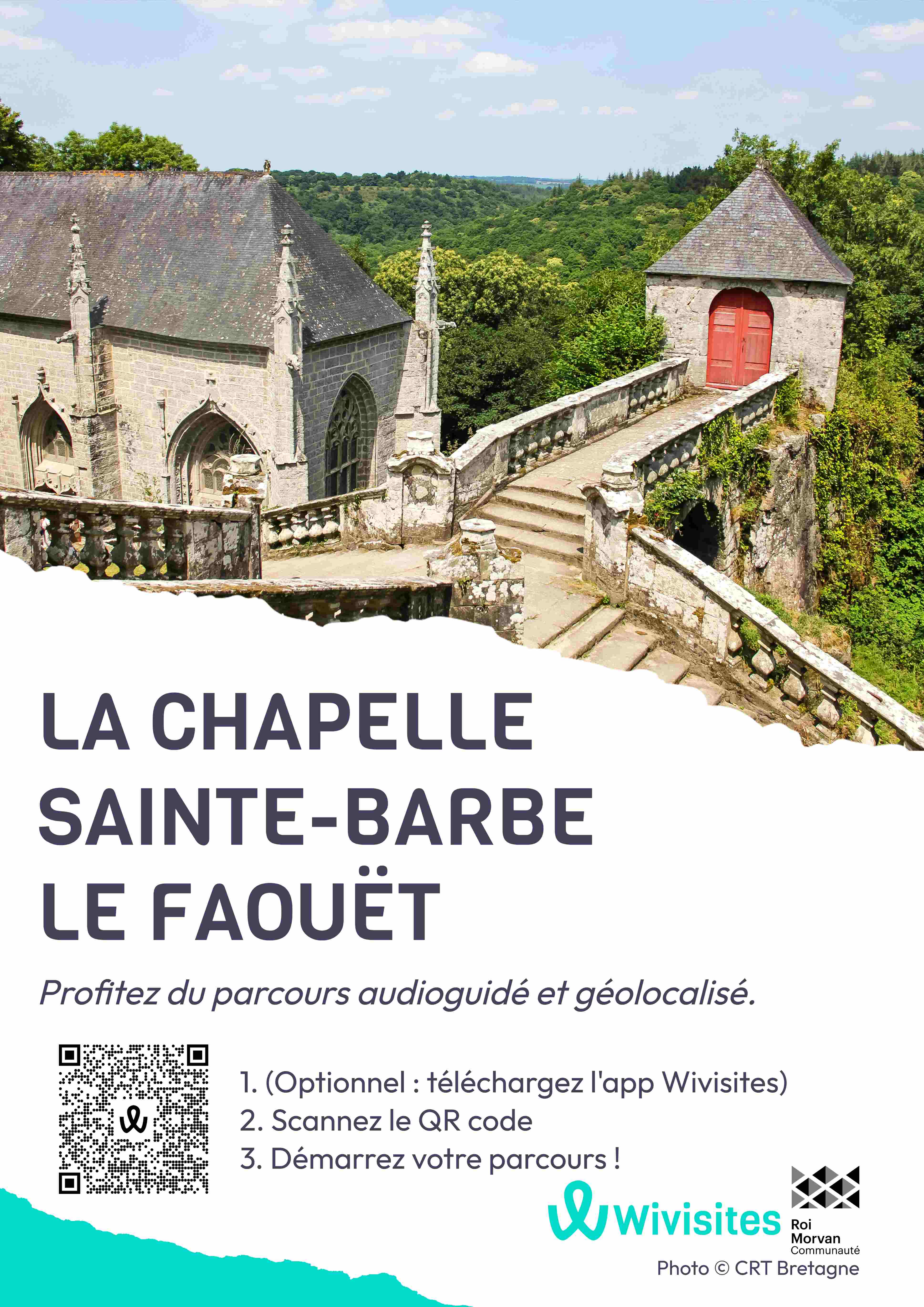 A la fin du XVe siècle, le cadet des seigneurs de Locmalo, Jean de Toulbodou quitte son manoir de Guidfoss en Plouray pour aller chasser. Alors qu’il se trouve sur les terres de Jean de Boutteville, seigneur du Faouët, il se fait surprendre par un orage d’une rare violence. Les gigantesques rochers qui l’entourent sont frappés par la foudre. Des quartiers de roches se détachent de la paroi verticale. Gagné par une extrême frayeur, Jean de Toulbodou voit sa fin approcher et prie alors Sainte Barbe, ordinairement invoquée pour se protéger du feu et de la foudre. Il lui promet, si elle le sauve, de lui ériger une chapelle en ce lieu. L’orage prend fin soudainement, Jean de Toulbodou est exaucé. Fidèle à sa promesse, il entreprend la construction de cette chapelle le 6 juillet 1489 en cet endroit si exigu. Elle s’achèvera en 1512. On retrouve en inscription gothique la date de commencement sur la console d’une statue placée dans le transept est. La date d’achèvement, quant à elle, figure sur un phylactère tenu par un ange ornant une clé de voûte.En arrivant sur le site de la chapelle, on découvre le campanile abritant une cloche ayant pour vertu d’éloigner la foudre. Les marches d’un escalier monumental mènent à l’oratoire Saint-Michel puis à un ossuaire encastré dans la roche et enfin à la chapelle.Celle-ci possède de nombreux pinacles à gargouilles surmontant des contreforts. La tourelle d’escalier hexagonale fait office de clocher. La façade occidentale est ouverte par deux portails composés chacun de deux portes jumelées.A l’intérieur, on remarque, comme dans l’église Notre-Dame à Kernascléden, une voûte en pierre sur croisées d’ogives, une exception pour l’époque où presque toutes les voûtes étaient en bois. Les armes des Boutteville et des Toulbodou, seigneurs fondateurs, sont présentes sur de nombreux écus de la voûte, ainsi que sur certains vitraux.Différentes scènes de la vie de Sainte Barbe figurent sur les vitraux du chœur de la chapelle. La tribune, supportée par trois colonnes, était réservée aux seigneurs fondateurs.Un sentier mène à la fontaine de dévotion. Celle-ci, datant de 1708, est aménagée dans un enclos carré à banc intérieur. Une niche abrite une statue de Sainte Barbe. Selon la légende, les jeunes filles célibataires y jetaient une épingle à tête ronde en tâchant d’atteindre l’orifice percé dans le bassin de la fontaine pour savoir si elles se marieraient dans l’année. En poursuivant sur le sentier, on accède aux berges de l’Ellé.
