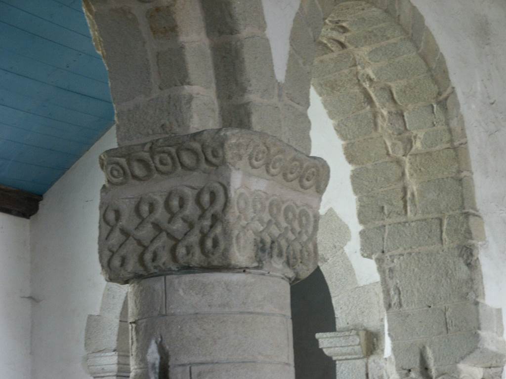 Ces dix-neuf chapiteaux de granit que recèle l’édifice ne sont qu’une partie de la série d’origine qui devait être composée d’au moins quarante éléments. Ces derniers ont disparu lors des différents remaniements. Ces chapiteaux sont somptueusement décorés de motifs géométriques typiquement caractéristiques de l’art roman : entrelacs surmontés de cercles, spirales, damiers…Certains décors ne sont, cependant, plus visibles. Bon nombre de ces motifs décoratifs sont en relation directe avec l’art celtique.